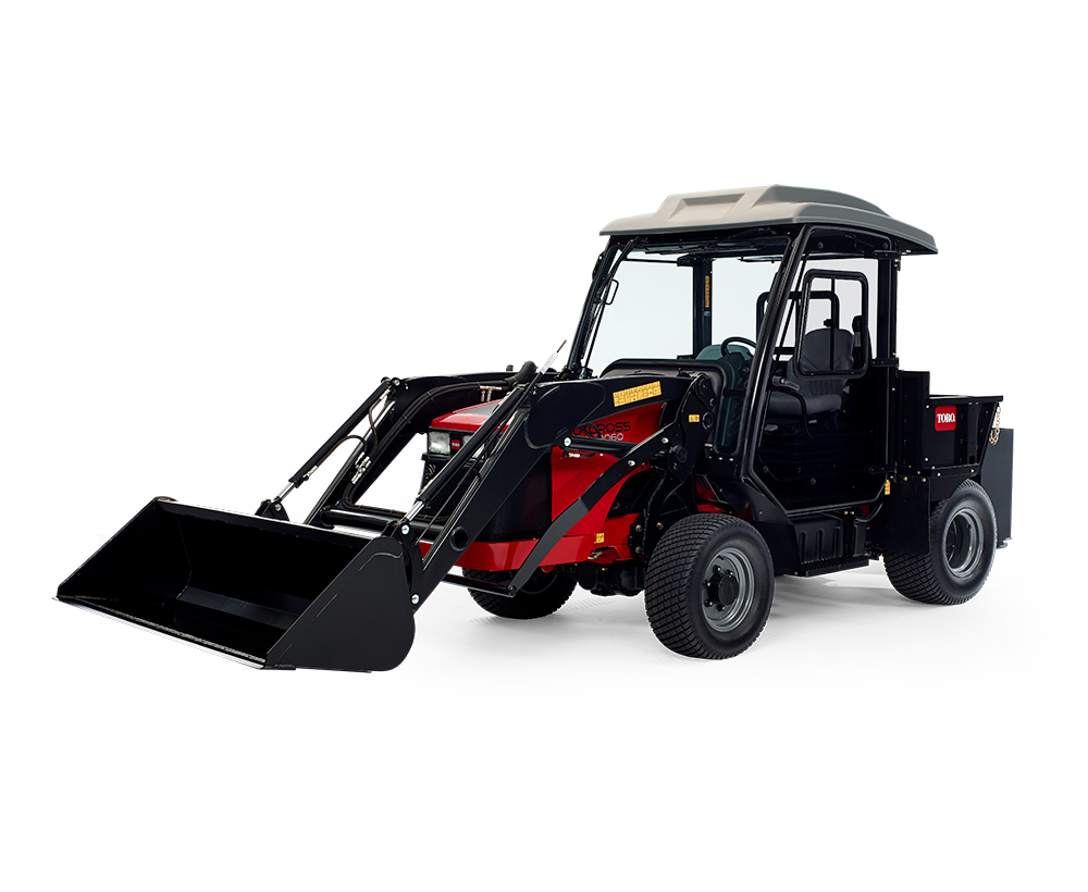 Take a quick look at the Toro Outcross and the chances are you will be struck by its unconventional appearance. The bonnet extends well forward of the front axle, with a cargo bed ahead of a rear three-point linkage. Add a front loader and a hefty ballast weight on the rear and you end up with a long, somewhat ungainly looking machine that looks like a cross between a tractor and utility vehicle.